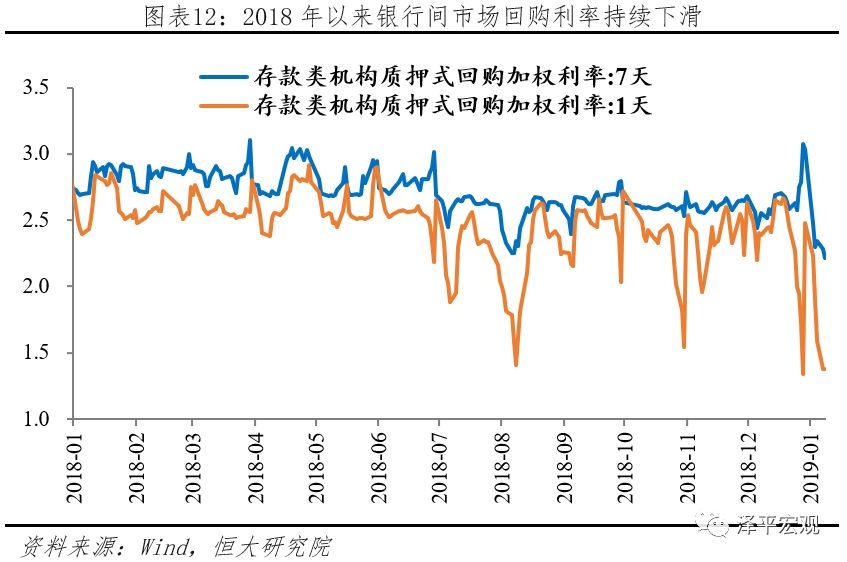 表内贷款乏力,货币政策边际放松,资金沉淀在银行体系内,导致隔夜利率降至3年新低,信用难宽。为支持小微企业融资,维护市场流动性,2018年央行4次定向降准,增加MLF操作,叠加2019年年初全面降准。但表内贷款增长乏力,央行提供的货币流动性并未顺利的通过银行转为市场流动性,而在沉淀在银行间市场。银行间机构质押式回购加权利率DR001和DR007快速下滑,2019年1月7日DR001利率报1.38%,与2018年8月和10月低点接近,频创2015年以来的低点,银行间流动性宽松。