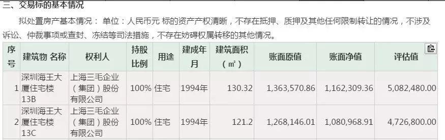 上海三毛此前公告显示,深圳海王大厦住宅楼13B、13C面积分别为130.32平米和121.2平米,账面原值分别为136.4万元和126.8万元,评估价格为980.93万元。从公司下调后的挂牌价格来看,出售均价在3.9万元/平方米。