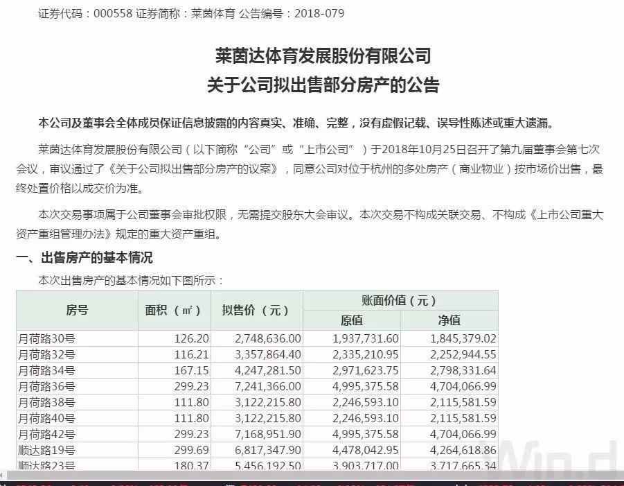 不少上市公司一次性出让多处房产,不乏规模上亿者。莱茵体育2018年10月底公告,公司计划出售杭州47套房产(商业物业),账面原值1.95亿元,拟售价达到了2.8亿元。公司表示,出售房产是为了盘活公司现有资产,优化资产结构,提高资产运营效率。