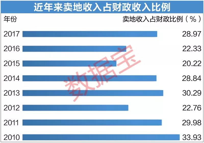 此外,从财政收入来看,2017年卖地收入占财政收入比达到28.97%,意味着政府每100元财政收入就有29元是卖地收入。