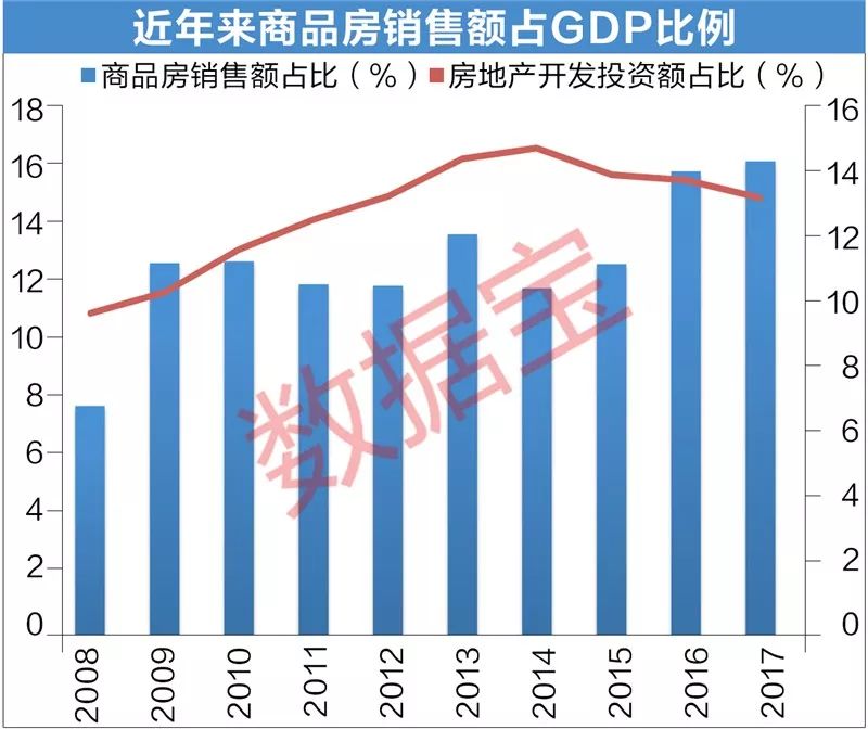 在房地产行业及房企市值大幅膨胀的过程中,国内经济土地依赖症也愈发严重。以历年商品房销售额与GDP比值计算,2017年该比值将达到16.16%。这一数据从某种程度上意味着,每100元GDP当中,就有16元是房地产创造。以房地产投资额占比看,2017年该比值也超过13%,意味着每100元GDP当中就有13元是房地产投资驱动的。