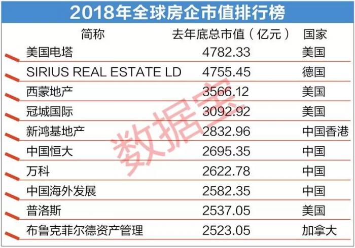 全球资本市场方面,市值前十房企几乎被中美企业瓜分,均有4家企业进入榜单。新鸿基地产位居全球第五位,中国恒大、万科、中国海外发展也进入前十。美国电塔成为全球房企市值最高企业,去年底市值达到4782亿元。美国的西蒙地产市值3566亿元位居第三位。