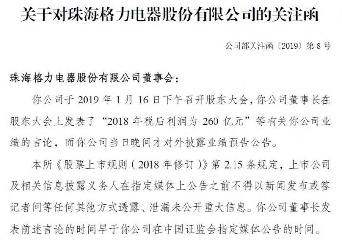 1月17日,深交所向格力电器下发关注函,董事长在股东大会上发表了“2018 年税后利润为 260 亿元”等有关你公司业绩的言论,而你公司当日晚间才对外披露业绩预告公告。