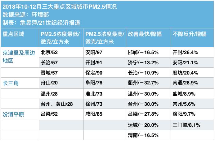 近日,环境部向重点区域相关省和城市人民政府发送了《关于通报重点区域2018年10-12月环境空气质量有关情况的函》。其中显示,京津冀及周边地区、长三角、汾渭平原三大“蓝天保卫战”重点区域涵盖的80个城市中,有21个城市2018年10-12月PM2.5浓度不降反升。