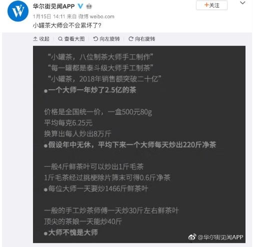 然而正是这一数据和小罐茶“大师作”的广告宣传,引起了网友的质疑。华尔街见闻APP官方微博称,20亿的销售额,平均到8位制茶大师,相当于每位大师一年要制作2.5亿元的小罐茶。照此计算,每位大师全年无休的情况下,每天要炒220斤净茶,1466斤鲜茶叶。