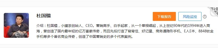 据了解,小罐茶创始人是“营销高手”杜国楹。资料显示,杜国楹还是背背佳、好记星、E人E本和8848钛金手机的打造者。