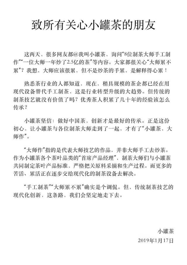 小罐茶声明还称,做好中国茶,创新才是最好的传承。会在传统制茶技艺的现代化创新这条路上坚持走下去。
