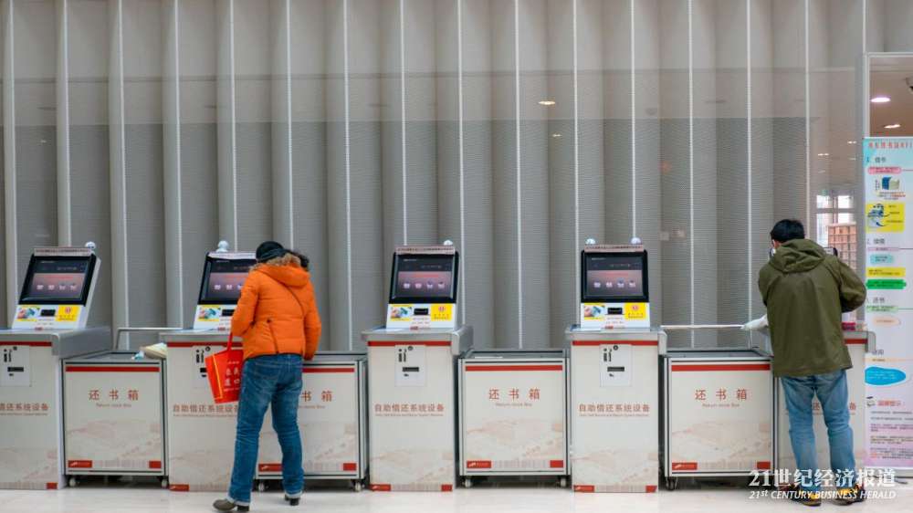 浦东图书馆内电子还书箱前还书的读者。升级后的浦东图书馆,引入的网络支付系统,读者借阅逾期费等款项可以用支付宝完成。