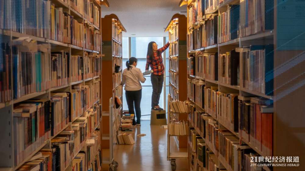 图书馆工作人员正进行书籍整理。