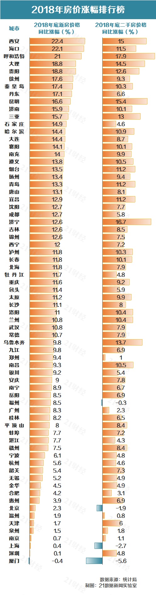 对比2017年底,在70个大中城市中,2018年底新房价格下跌只有厦门,深圳、上海、南京这三个城市涨幅不超过1%,西安、海口、呼和浩特涨幅均超过20%。