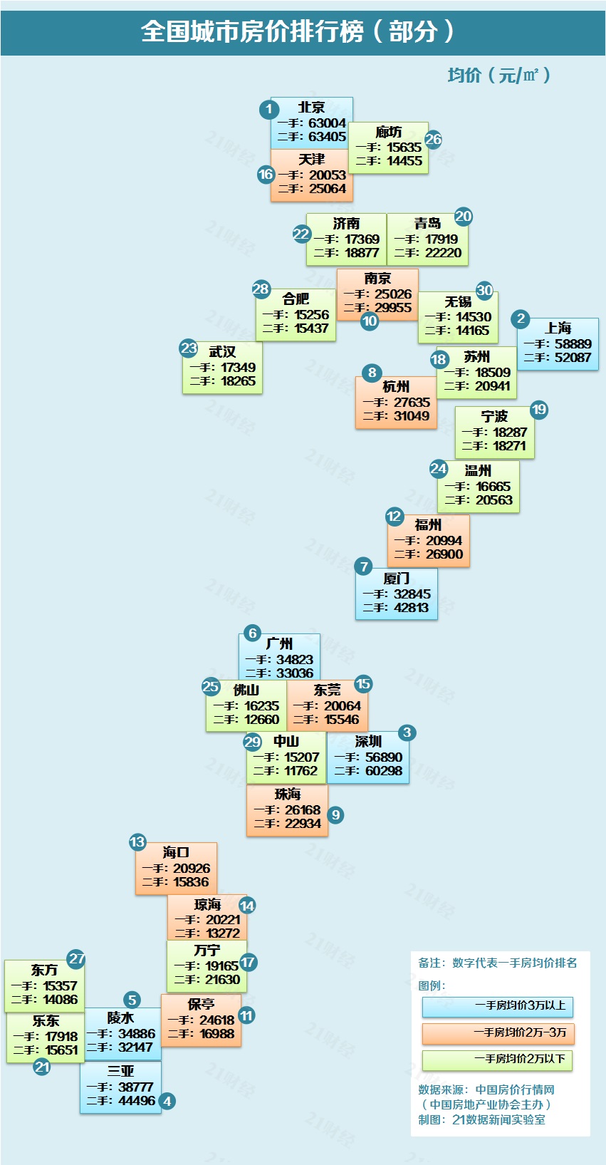 北京、上海、深圳的新房及二手房均价都超过5万元每平米,稳居前三。