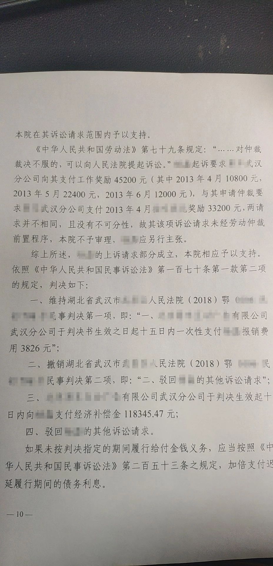 2018年8月3日,武汉市中级人民法院做出终审判决,判令公司一次性支付谢某报销费用3826元,并向谢某支付经济补偿金118345.47元。