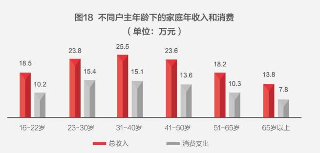 户主年龄在31-40岁时家庭平均年收入最高,达到25.5万元,其次为23-30岁的家庭,平均年收入23.8万元。