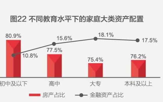 学历与房产配置负相关,学历为初中及以下的家庭,房产占比高达80.9%;高于本科及以上的学历家庭,房产占比76.2%