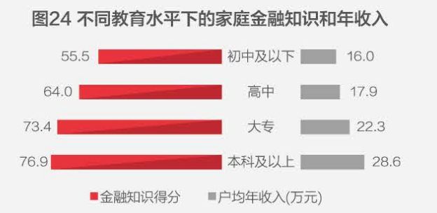 学历越高的家庭,户均年收入越高,金融知识水平也约稿。如本科及以上的家庭,户均年收入为28.6万元,金融知识得分76.9分;而初中及以下的家庭,户均年收入则为16万元,金融知识得分55.5分。