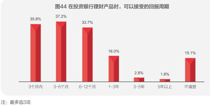 三是,家庭可接受的银行理财产品回报周期普遍较短,缺少长期理财规划。对于可接受的银行理财产品的回报周期,选择3个月内、3-6个月、6-12个月的家庭占比分别为35.8%、37.2%和33.7%,可见大多数家庭接受的是1年及以下的回报周期。