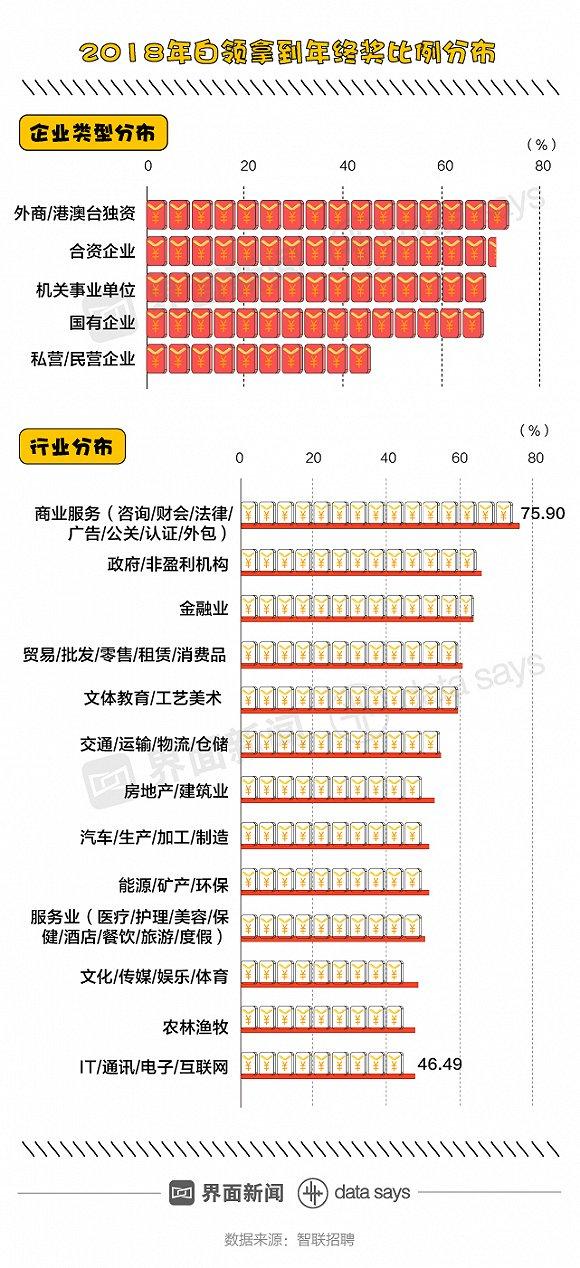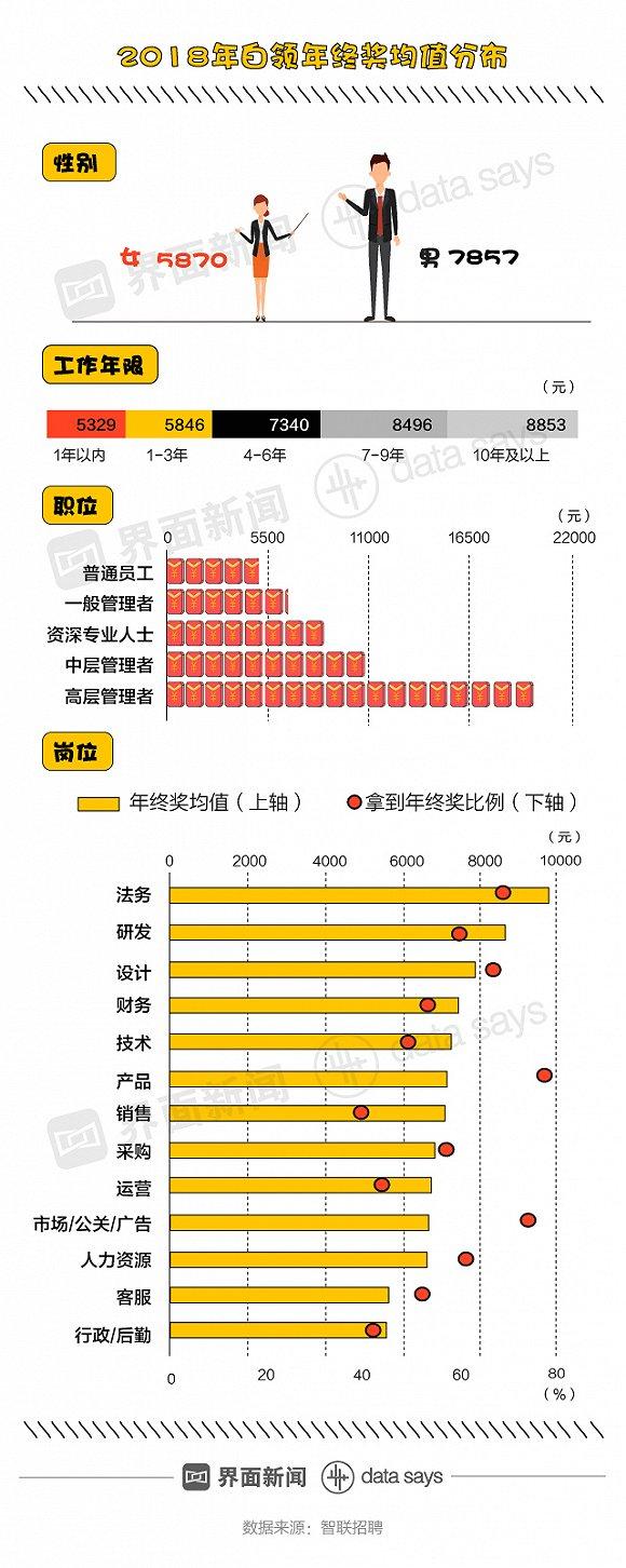 图解丨2018年不足六成白领有年终奖,平均比上年少拿近200块