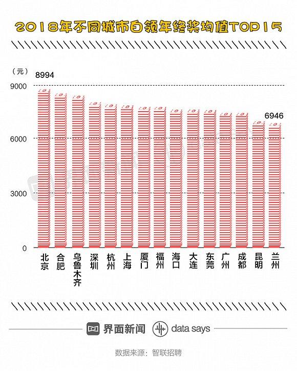 分城市来看,北京白领的年终奖均值最高,近9000元;合肥、乌鲁木齐的年终奖均值分列第二、三位,超越深圳、上海和广州。