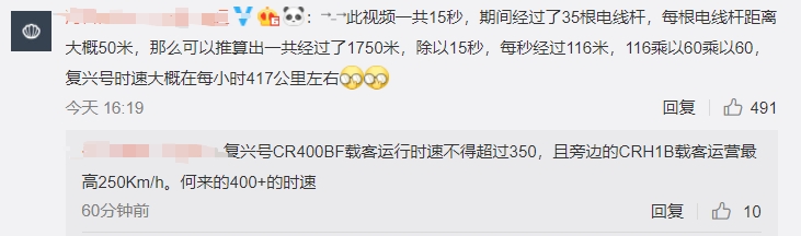 还有“学霸”推算出复兴号的时速为417公里左右,明显与规定的时速不符。