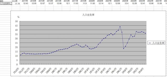 国家统计局数据显示,2018年全年出生人口1523万人,比2017年出生的人口1723万数字下降了200万。2018年全国出生率为10.94‰,比2017年的12.43‰有所下降。2018年人口自然增长率为3.81‰,是1962年以来最低。2018年劳动人口数量也是首次下降。