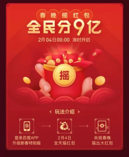 第三步,除夕当天登录百度APP新春特别版,全天摇出总额高达9亿元的红包。