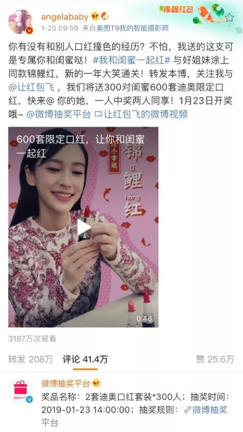 从互动效果来看,这招已然奏效。“600套口红送300对闺蜜”这条锦鲤红包微博已经吸引超过200万人次转发。