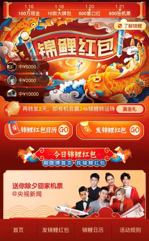 1月16日,新浪微博推出“让红包飞”活动升级版“锦鲤红包”,玩法和传统抢红包略有不同,转发+关注博主才可参与抽奖。