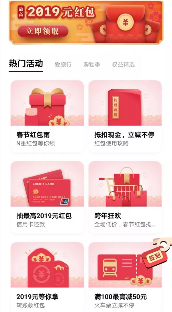 打开云闪付APP首页就能看到,还支持信用卡还款红包(最高2019元,每张卡1次、每月5次)、签到领红包(最高8.8元)、推荐红包(邀请者可得8-16元,被邀者则最高2019元),转账红包(最高2019元)、12306 APP购买火车票使用“中国银联”支付还能获得满减优惠、随机立减。