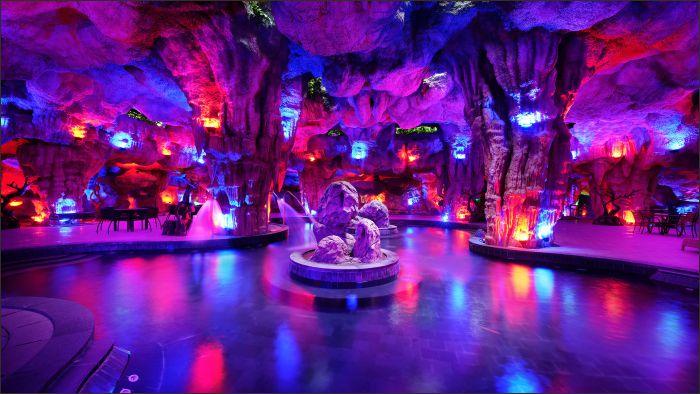 山谷温泉坐落于溶洞、绿荫葱郁之间,四周山景尽收眼底。山谷温泉共分中药保健区、常温戏水区、溶洞原汤区三个功能区,总计超过55个各式汤池。酒店温泉是白水寨景区优质泉水,出水水温52℃-73℃,属偏硅酸泉,富含氟、锂、锌、钾、氯、钙、镁等多种对人体健康有益的微量元素,具有软化皮肤角质、光滑皮肤、防衰老防治心血管疾病、调节神经功能紊乱的作用,是保健、治疗、美容型温泉矿泉水。