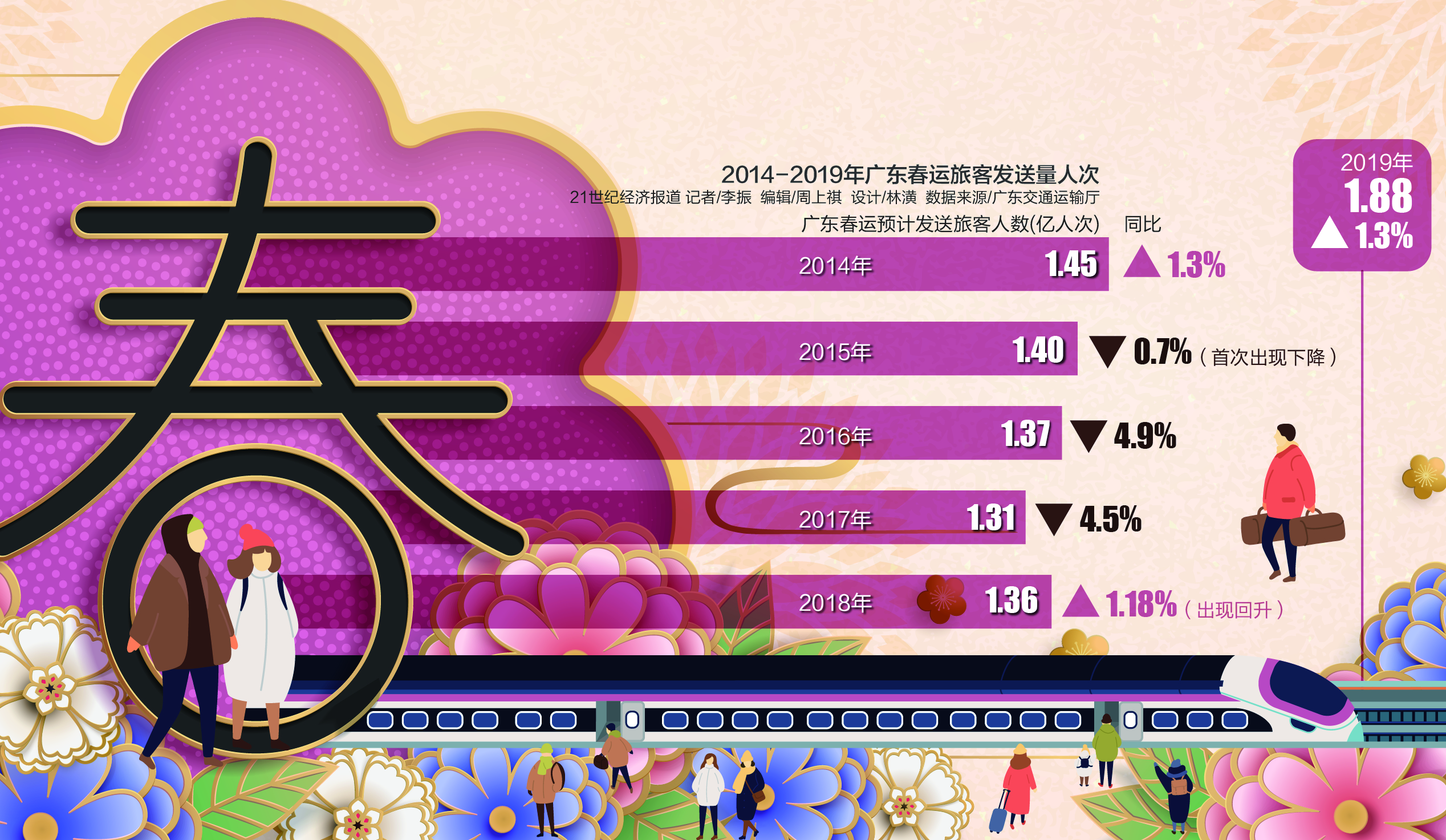 21世纪经济报道记者注意到,在广东春运旅客发送量近5年的变化中,两个时间点尤为特殊——2015年与2018年。2015年广东春运旅客发送量开始转向递减趋势,持续了3年;2018年,广东春运旅客发送量再次回升,尤其在2019年实现1.88亿人次,超过历年数据。