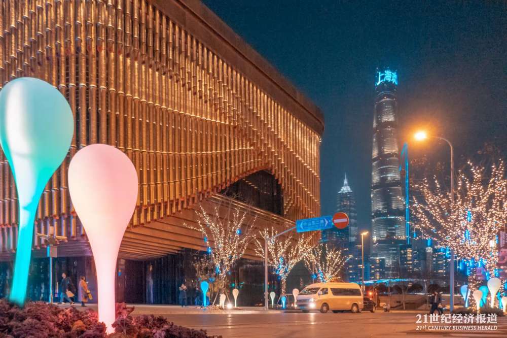 外滩金融中心的“星光奇境”灯光秀融于现代建筑中。