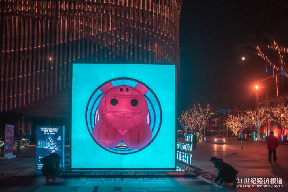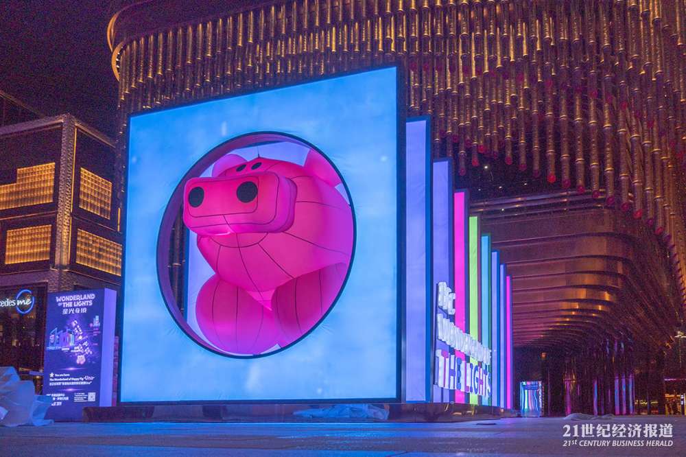 灯光秀分别由“星光”与“奇景”两大部分组成。位于金融中心北广场的“UNA”装置,是一头高4米来自“仙女座”的快乐猪,其粉红圆滚造型憨态可爱。