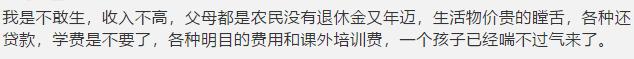 在众多读者的“现身说法”中,生养成本高被频频提及,尤其是教育成本。从幼儿园到各种课外辅导班、培训班,从小学、初中、高中,再到大学,持续N年的教育开支让年轻人们瑟瑟发抖,网友强烈呼吁教育改革。