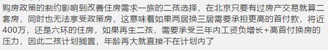 有数据显示,2004-2017年房贷收入比从17%增至44%。望尘莫及的房价,给年轻人生育孩子带来了很大的压力。而想生二胎的家庭,往往意味着要更换一套更大的住房。有网友表示,“购房政策的制约影响到改善住房需求一族的二孩选择,在北京如果两居换三居需要承担更高的首付款,将近400万,还是六环的住房,如果再生二孩,需要承受三年内工资负增长+高首付换房的压力,因此二孩计划搁置,年龄再大就直接不在计划内了。”