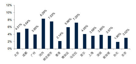 如果按照板块划分,河内和胡志明市办公楼的实际租金收益率分别达到8.29%和7.53%,居于主要亚太城市榜首。
