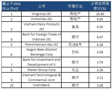 在胡志明指数前十大成份股中,金融股、地产股、消费股占比较高。