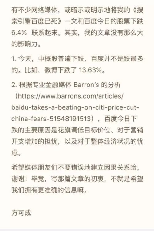 有人将股价与文章联系起来,对此今天上午,《搜索引擎百度已死》一文作者方可成称,二者没有因果联系: