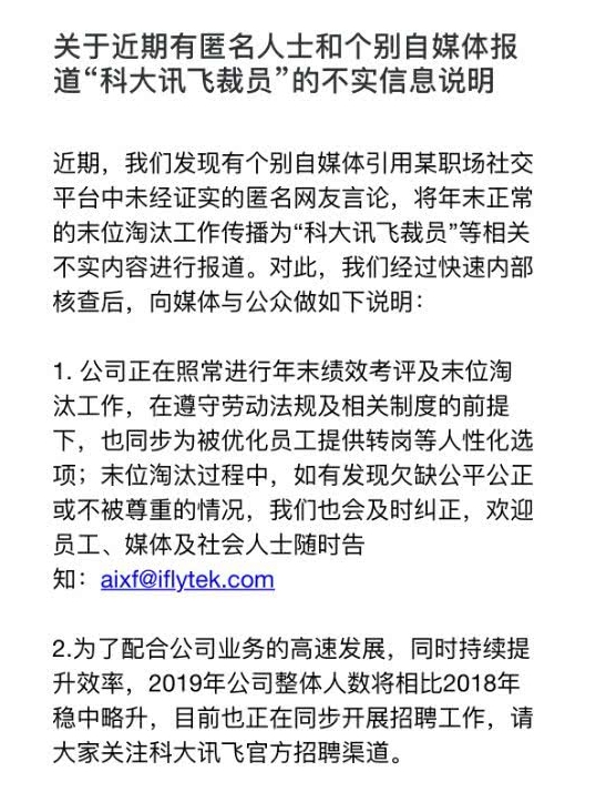 1月23日。针对近日关于”大幅裁员”的传言,科大讯飞对媒体发布回应表示,相关传言系不实信息,公司正在进行年末业绩考评及末位淘汰工作,也同步为被优化员工提供转岗等人性化选项。科大讯飞还称,2019年公司整体人数将比2018年稳中略升,目前也正在同步开展招聘工作。