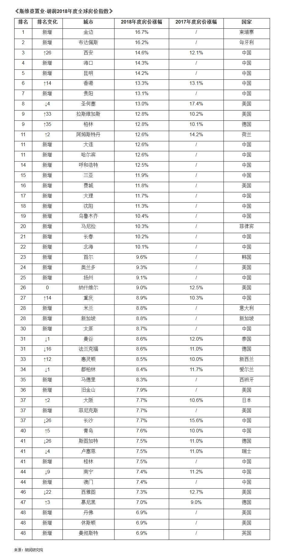 《房价指数》显示,柬埔寨金边2018年跃居全球房价涨幅第一,涨幅达16.7%;房价涨幅第二位的是匈牙利布达佩斯,涨幅达16.2%;排在第三位的是中国城市西安,房价涨幅达14.6%,是中国房价涨幅最快的城市;排在第四、第五、第六位的也都是中国城市,依次是海口、昆明和香港,涨幅分别14.3%、14.2%和13.3%。