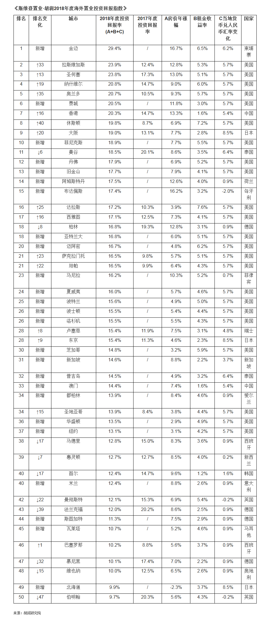 报告显示,全球房价涨幅最高的前50名城市中,有22个涨幅超过10%,第50名涨幅6.9%。海外置业投资回报率最高的前50名城市中,有7个回报率超过20%,第50名回报率9.7%。