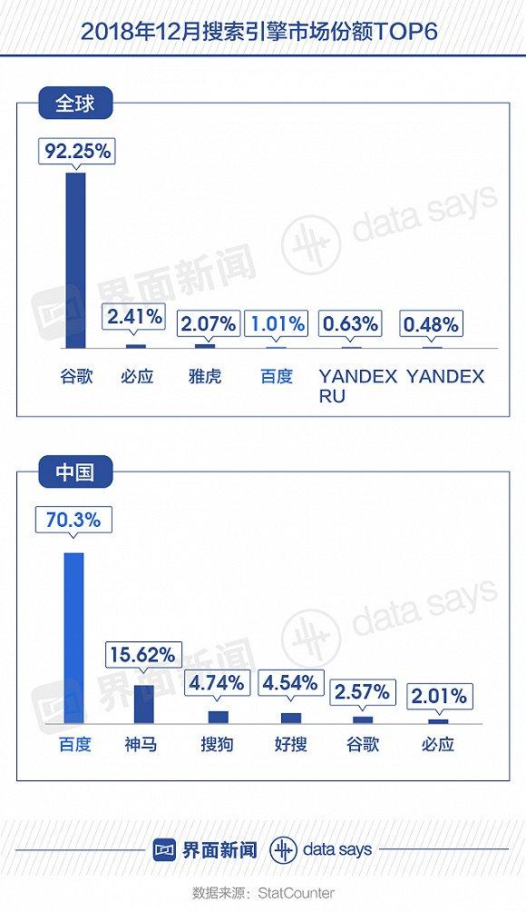 美国网站通讯流量监测机构StatCounter数据显示,2018年12月,百度在中国搜索引擎市场占有率超过70%,而全球市占率仅有1%。它的竞争对手谷歌(NASDAQ:GOOGL),全球市占率达到92%,中国市占率仅有2.57%。