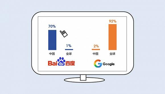 它的竞争对手谷歌,全球市占率达到92%,中国市占率仅有2.57%。