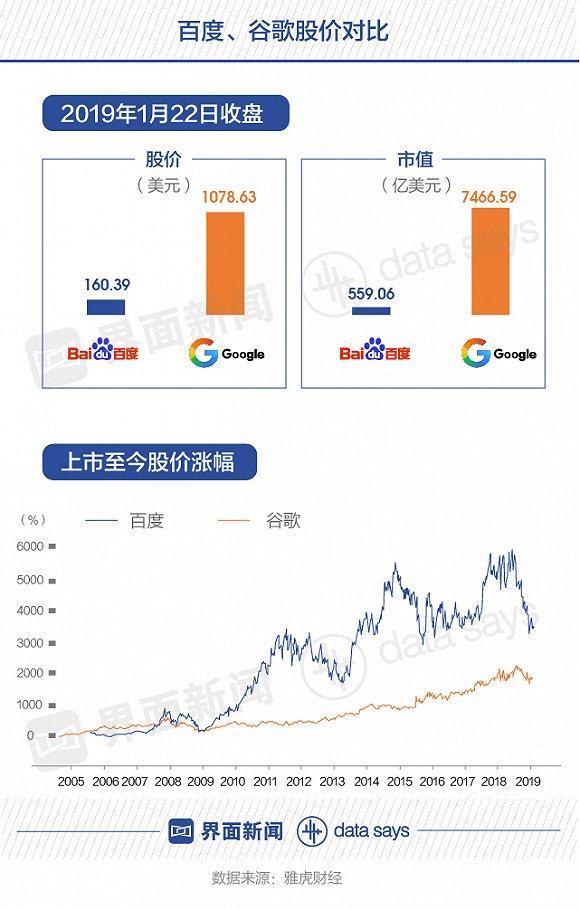 截至1月22日收盘,百度市值约为559亿美元,约为谷歌市值的1/13。