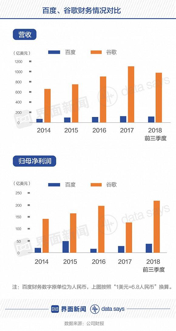 2017年,谷歌营收总额超过1100亿美元,是百度的8.9倍;谷歌归母净利润为126.6亿美元,是百度的4.7倍。