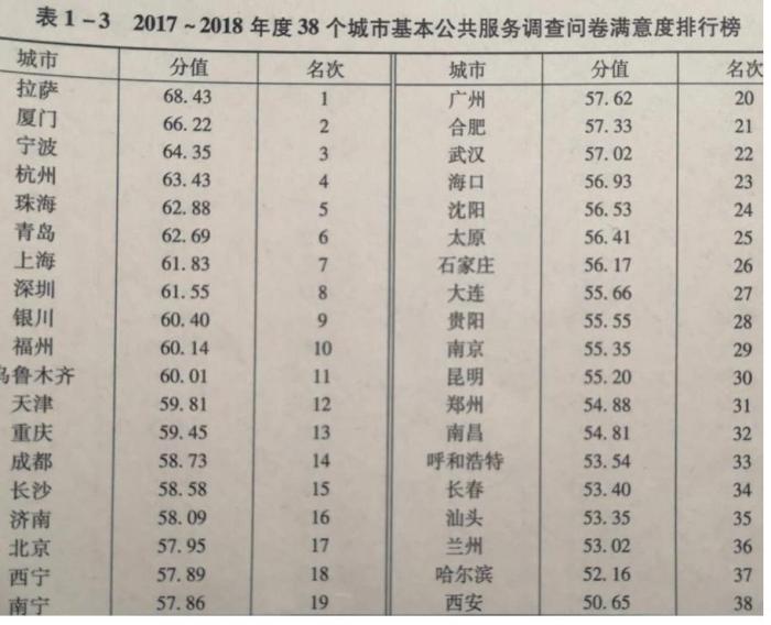 该蓝皮书指出,2018年我国38个主要城市基本公共服务满意度排名中, 前六的城市为:拉萨、厦门、宁波、杭州、珠海、青岛。一线城市均不在前六名。