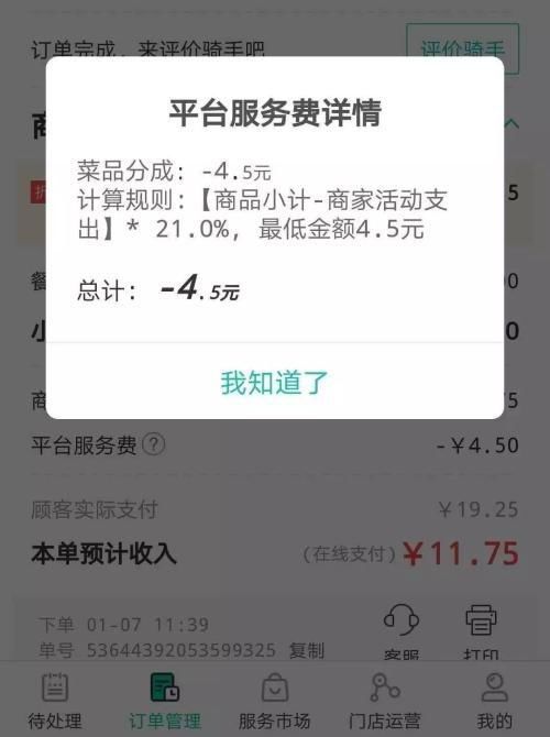 (某商家展示的外卖订单中佣金抽成。美团针对其订单金额在21元以下的,每单最低佣金收取固定的4.5元,佣金折算后是23%左右)