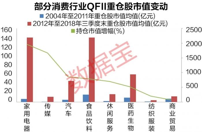 为分析持仓变化,分两个时间段:2004年至2011年,2012年至2018年三季度末,分别计算各行业两个时间段的持仓市值平均数,并计算变动情况。可以看出,大消费类的持仓市值增加最为显著,也就是消费板块最受QFII青睐,这一偏好与北上资金吻合。