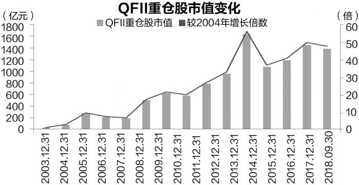 中国上市公司研究院统计显示,QFII重仓股市值由2004年的29.18亿元增加至2018年三季度末的1380.98亿元,15年来增长超46倍。2014年末,QFII重仓股市值超过1600亿元,创下了QFII开通以来最大规模。