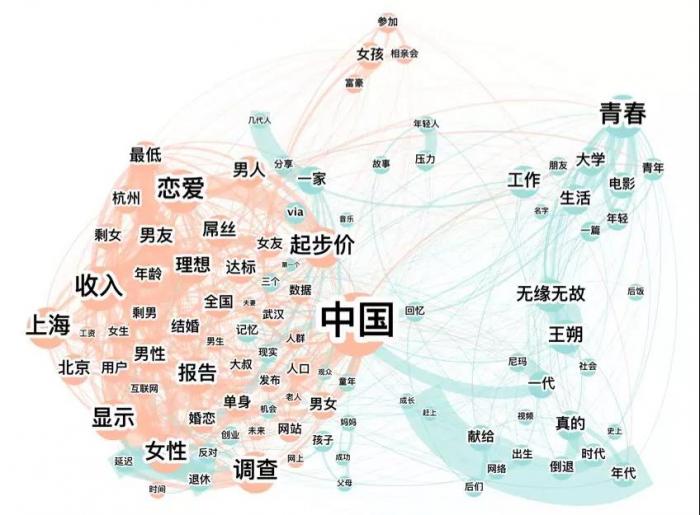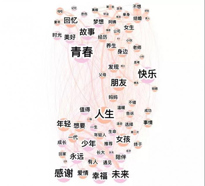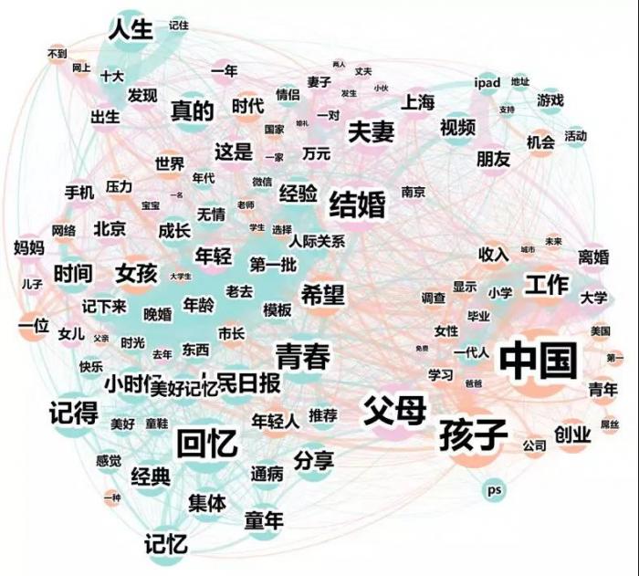 具体来说,社群1中出现了“童年”、“成长”、“青春”、“大学”、“回忆”、“记忆”、“年轻”、“妈妈”、“王朔”、“压力”等热词,显示这一部分语义群主要涉及正在经历中年危机的70后,回忆、怀念自己的青春年华,与现实中所面对的种种“压力”形成鲜明对比,引发了不少关于时光易逝的感慨。