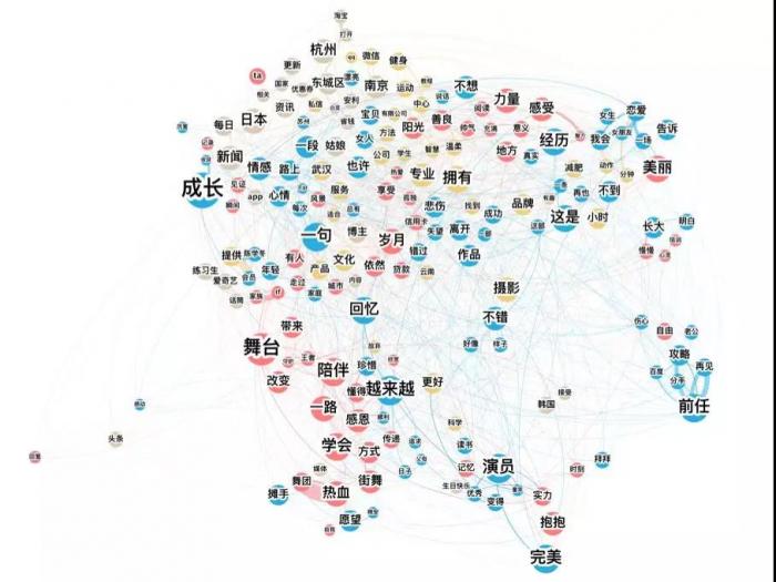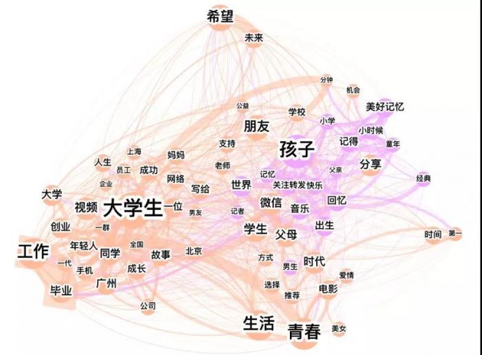 社群2中出现了“大学生”、“工作”、”“机会”、“时代”、“公司”、“创业”、“大学”等热词,显示这一部分语义群主要涉及接受完大学教育,刚刚走入职场的90年代生人,在刚开始奋斗阶段的状态。其中,“梦想”、“青春”、“奋斗”等热词显示,总体基调积极向上。